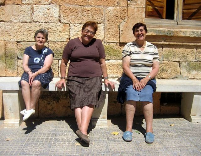 images -- Justa, Dorita y Milagros tomando el sol de la mañana en el banco de la peña, Agosto 2007.
